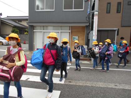 5年生が元気に学校にバスから降りてきました。帰校式を行いました。