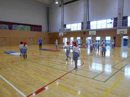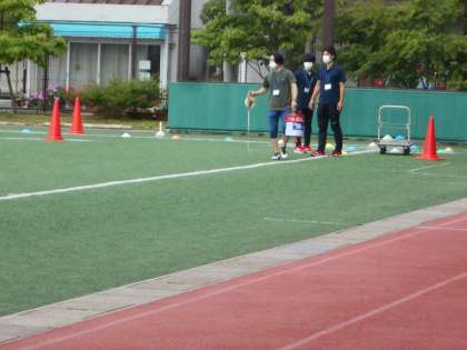 雨もあがり、縦割りでスポーツテストを行う16日(木)です。朝から教員で準備をしました(左)。
