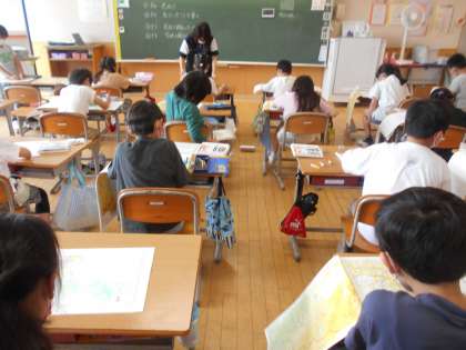 3年生は社会科で来週の社会見学を見越し、白地図で富山市を確認していました(右)。