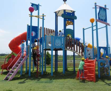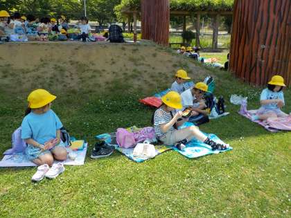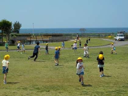 グループごとに海の方向を見ながらお弁当を食べて、冒険広場やイベント広場で元気に遊びました。