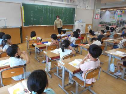 1年生は学校の教職員のなかよくなる学習を生活科で展開し、学校中を飛び回っています(右)。