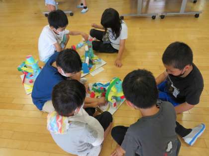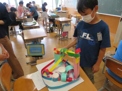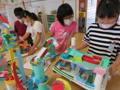 昼休みに完成したコロコロガーレで、楽しみながら遊んでいます。一人一人の工夫したところは、おもしろさにつながっています。