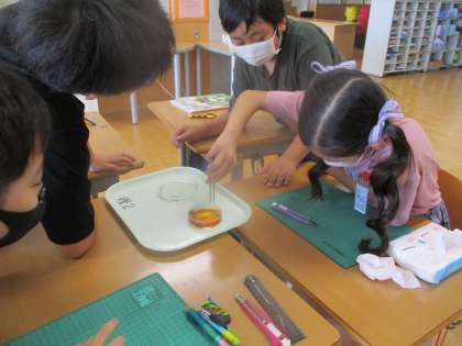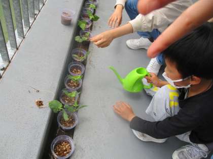 子供たちが理科の授業で育てているインゲンマメが順調に成長しています。子供たちは自分が育てているインゲンマメに毎日欠かさず水をあげ、成長している様子を観察しています。今回はヨウ素液を使って、種子や子葉の養分について調べる実験をしました。