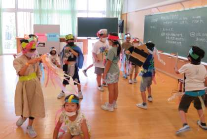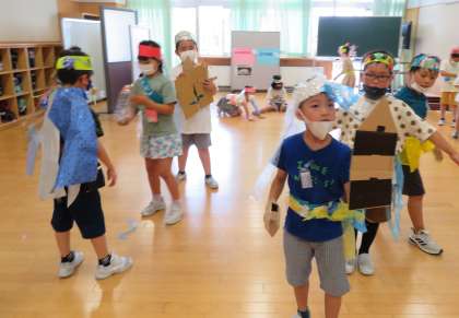 頭や腰に、飾りを付けた輪っかを付けて変身です。女王様、剣士、妖精、クラゲ、忍者・・・イメージをいろいろ広げて飾り付けをしました。変身が完成した後は、みんなにお披露目をし楽しみました。