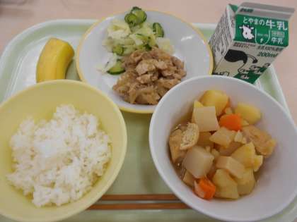 本日の献立は、豚肉のジャンロー、刻み和え、炊き合わせ、バナナ、です。