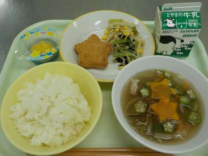 今日の献立は、ごはん、牛乳、星形メンチカツ、コーン和え、天の川スープ、たなばたゼリー です。