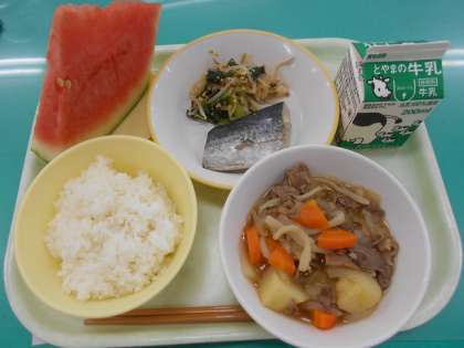 本日の献立は、肉じゃが、鰆の塩焼き、炒り大豆和え、すいか、です。