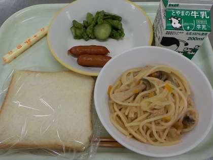 今日の献立は、食パン、牛乳、ツナとキャベツのスパゲッティ、あらびきウインナー、棒チーズ です。