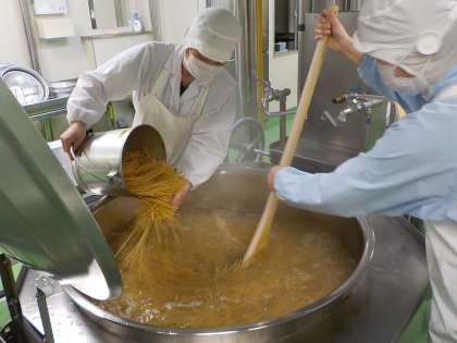 写真(下)はスパゲッティを茹でているところです。子供たちが食べるときにちょうど良い硬さになるよう、茹で加減を考えています。