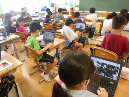 左は3年生が算数を、中は4年生が端末を使った理科の植物変化を、右は5年生のバウンドバレーボールの頑張りです。