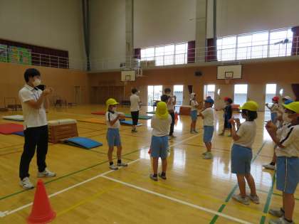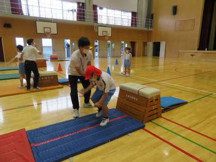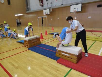 スポーツ指導員派遣事業で「跳び箱教室」がありました。跳び箱を使った簡単な動きから教わりました。