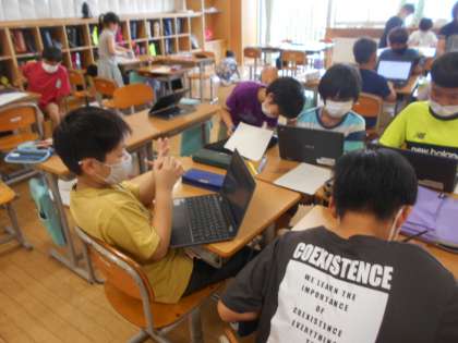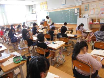 3年生の国語の俳句の学習(左)、4年生の国語の係新聞の学習(中)、5年生の家庭科ボタン付けの学習(右)の様子です。