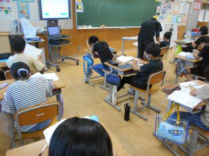 写真は、2年生が国語で文章の書き方(左)を、5年生が学級集会の準備(中)と、算数の合同な図形の書き方(右)です。
