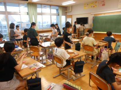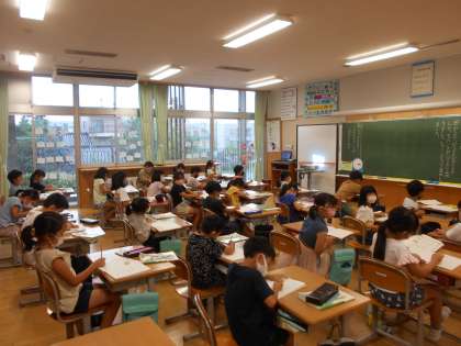 写真は、2年生が国語で文章の書き方(左)を、5年生が学級集会の準備(中)と、算数の合同な図形の書き方(右)です。