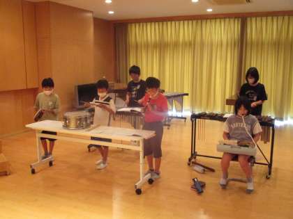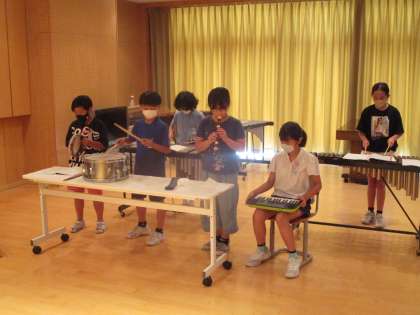音楽科「リボンのおどり」の学習では、リコーダー、鍵盤ハーモニカ、木琴、鉄琴、小太鼓、タンブリンなどの楽器を使って、合奏を行っています。子供たちはチームに分かれて、「終わりに向かってだんだん盛り上がるように楽器の音の重なり方を工夫したい」「1回ごとに楽器の響きが変化するように重なり方を工夫したい」など、パートの重ね方を工夫して、音が重なり合う響きを楽しみながら演奏する姿が見られました。