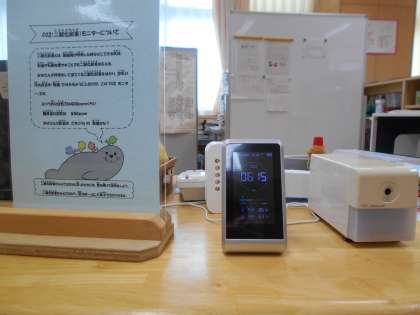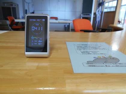 各階教室付近では、CO2測定モニターを活用しています。この測定器は、二酸化炭素による空気のよごれ具合を数値化するものです。学校では、適切に換気を行い、新型コロナウイルス感染症予防に努めております。