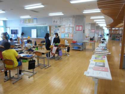 2学期がスタートしました。各教室の黒板には、担任からのメッセージが書いてありました。夏休みの作品の整理の他、雑巾等も提出していました。