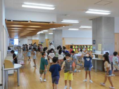 写真は、動画に合わせてダンスを踊る2年生、先生の周りに集まる1年生です。