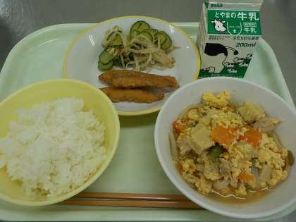 今日の献立は、ご飯、牛乳、わかさぎのフリッター、甘酢和え、高野豆腐の卵とじ です。