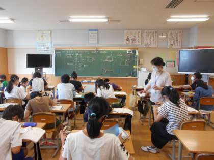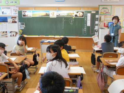 4年生が国語で名作「ごんぎつね」に挑み(左)、5年生が国語で新聞の見出しについて話し合い(中)、6年生が算数で頭を悩ませていました(右)。