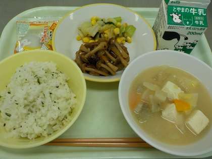 今日の献立は、菜めし、牛乳、ハンバーグのきのこソースかけ、コーン和え、さつま汁、月見大福です。9月の十五夜に合わせて「月見献立」となります。