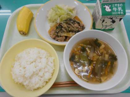 本日の献立は、豚肉のキムチ炒め、茹でキャベツ、茎わかめスープ、バナナ、です。