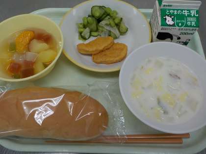 今日の献立は、コッペパン、牛乳、チキンナゲット、えごまドレッシングサラダ、白いんげん豆のクリームスープ、フルーツカクテル です。