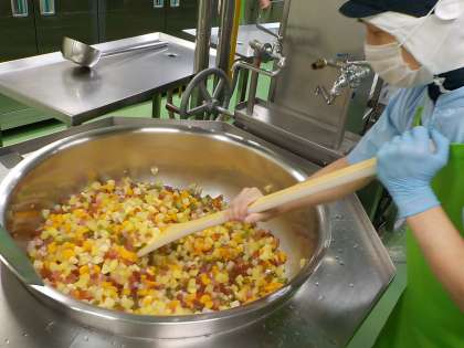 写真(下)は「フルーツカクテル」を混ぜ合わせているところです。中央小では食数が多いので、大きな釜を使って作っています。