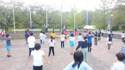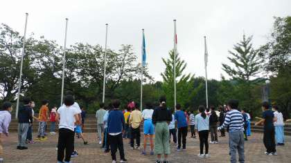 2日目の朝です。朝の集いでは、元気にラジオ体操を行いました。今日もよい天気になりそうです。