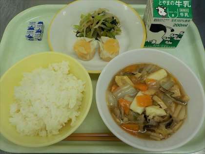 今日の献立は、ごはん、牛乳、にんじんシューマイ、小松菜ひたし、八宝菜、ポケットチーズ です。