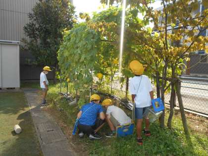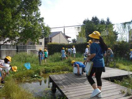 昆虫などの動物を探して、どんなところをすみかにしているかを調べました。ビオトープの周りやグラウンドの周りで、トンボやアリ、バッタ等を見つけることができました。