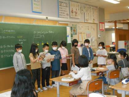 また、今日は、「読書フェスティバル」の日でした。体育館でひだまりの会の方の読み聞かせを聞いたり、学級でビブリオバトルをしたりしました。チャンプ本を決める活動は大盛り上がりでした。(右)