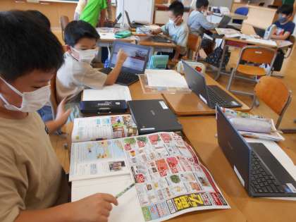 店にある品物はどこから運ばれてくるのか調べました。家から持ってきた折り込みチラシやWEBチラシも参考にしています。日本各地だけでなく、外国からも品物が運ばれていることに驚いていました。
