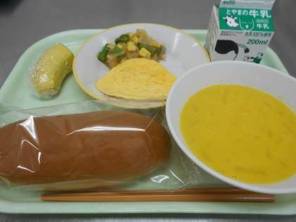 今日の献立は、黒糖コッペパン、牛乳、オムレツ、アスパラサラダ、かぼちゃポタージュ、バナナ です。