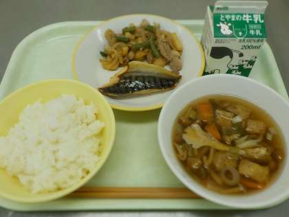 今日の献立は、ごはん、牛乳、さばの塩焼き、マコモタケの炒め物、きのこ汁 です。