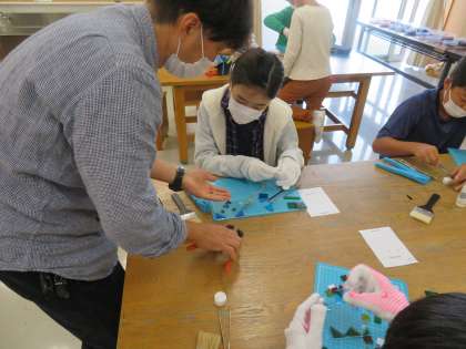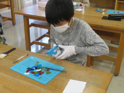ガラス工房の先生に来校いただきました。ガラス用のカッターナイフ等、初めて使う道具の使い方を教わり、楽しく製作することができました。