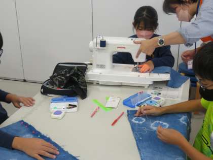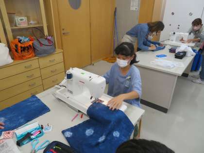 家庭科では、手提げかばんを作っています。自分で藍染めした布を、ミシンを使って縫い合わせました。今日は、学習ボランティアの方に来校いただき、ミシンの操作や、しつけ縫いを補助してもらいながら作っていきまいした。