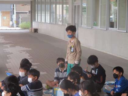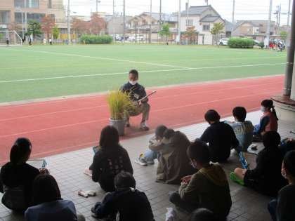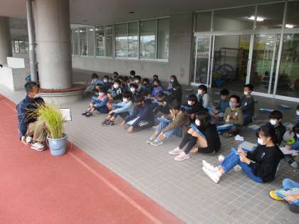 総合的な学習の時間にJAなのはなの方をお招きして、「セントラル水田」で育てた稲を収穫しました。まず、JAなのはなの方から5月から育てている「バケツ稲」の状態について教えていただきました。子供たちは真剣に話を聴いたり、積極的に質問したりしながら、どうしたら「バケツ稲」からもっとたくさんの米を収穫できたのかを考えて、メモをとる姿が見られました。