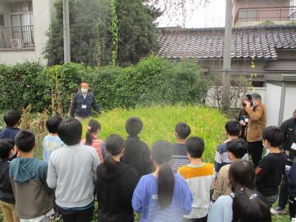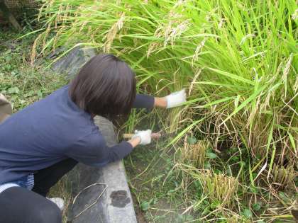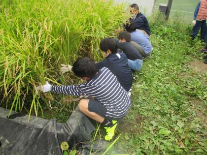 5月の田植えから、今までずっとお世話を続けてきた「セントラル水田」の稲を手作業で刈り、米を収穫しました。子供たちは鎌の使い方に苦労しながら、力を込めて稲を刈っていました。