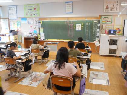その4年生が書写で曲がるひらがなに挑戦していました(左)。これが難しい。