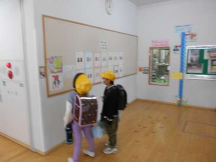児童玄関には、先日の読書フェスティバルのビブリオバトルのクラス代表が掲示されました(右)。誰が選ばれたか、お子さんに聞いてみてください。