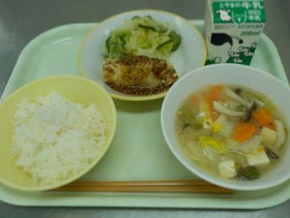 今日の献立は、ごはん、牛乳、ふくらぎのごまだれがけ、あわせ和え、五目みそ汁 です。