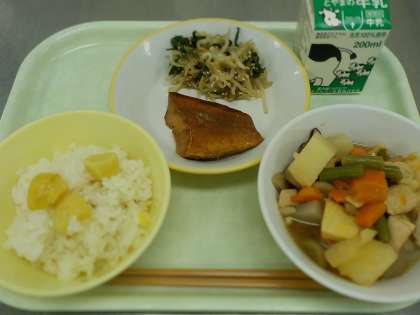 今日の献立は、栗おこわ、牛乳、赤魚の照り焼き、香味和え、筑前だき です。