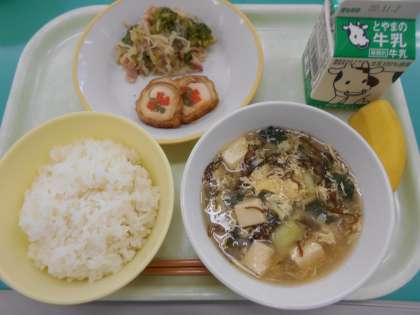 本日の献立は、野菜の肉巻き、切り干し大根のペペロンチーノ、卵ともずくのスープ、バナナ、です。