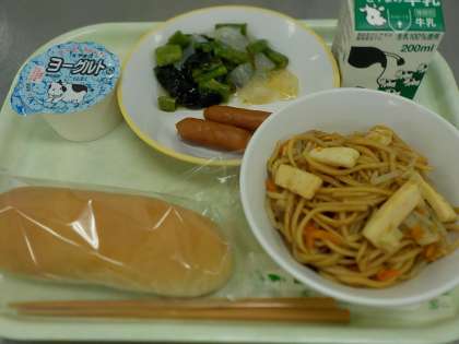 今日の献立は、減量コッペパン、牛乳、あらびきウインナー、こんにゃくサラダ、いか焼きそば、ヨーグルト です。