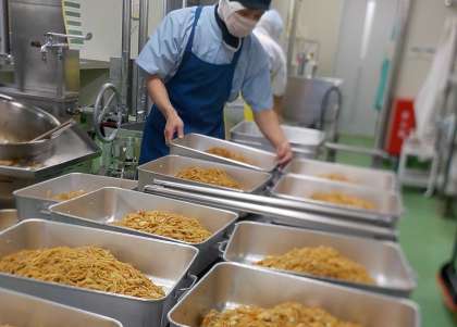 写真(下)は焼きそばをクラスごとに分けているところです。珍しいメニューなので、子供たちに大人気です。