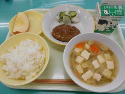 本日の献立は、和風煮込みハンバーグ、きざみ和え、豆腐のみそ汁、りんご、です。