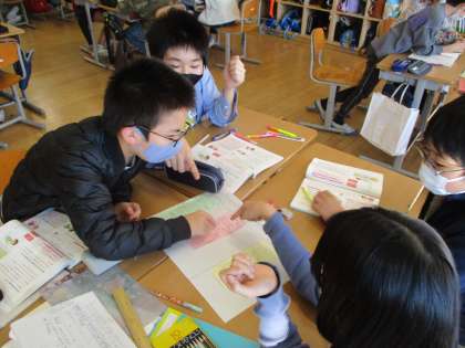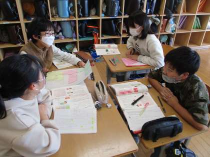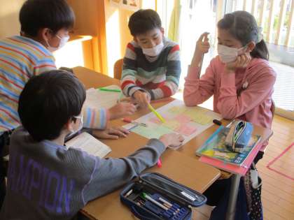 国語科「よりよい学校生活のために」の学習では、どうすれば学校生活をもっとよくしていくことができるかについて話し合いました。子供たちは、学校生活の中から議題を決め、付箋を使って自分の立場を明確にしながら話し合いを行いました。「考えを広げる話し合い」や「考えをまとめる話し合い」を通して、みんなの意見を組み合わせることで、よりよい解決方法を考え出すことができることを学びました。