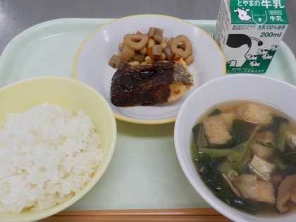 今日の献立は、ご飯、牛乳、魚の甘みそかけ、五目煮豆、うすくず汁 です。