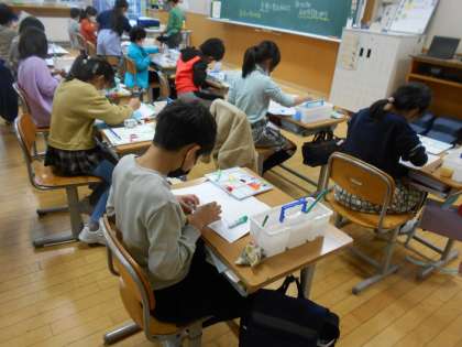 1年生が年長児を迎えて行う交流会の計画を立てています(中)。3年生は水彩を使った図工に挑戦です(右)。